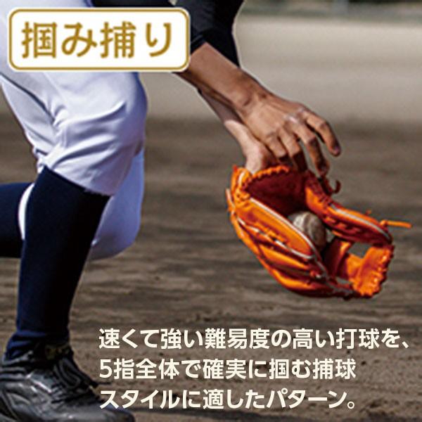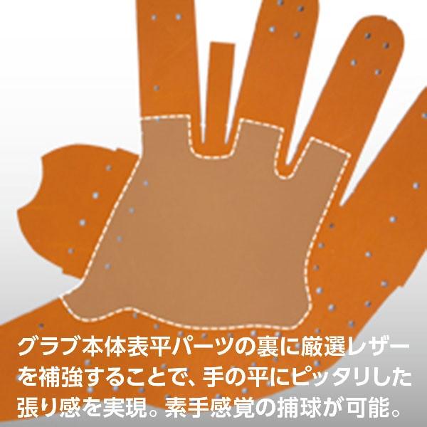 ・素手感覚の追求:グラブ本体表平パーツの裏に厳選レザーを補強することで、手の平にピッタリした張り感を実現。素手感覚の捕球が可能。