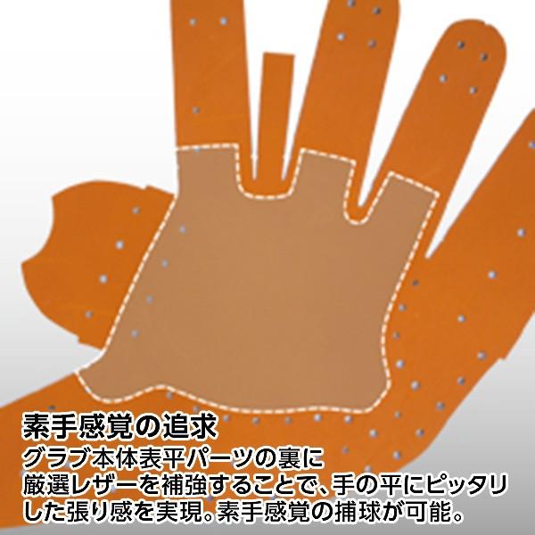 ・素手感覚の追求:グラブ本体表平パーツの裏に厳選レザーを補強することで、手の平にピッタリした張り感を実現。素手感覚の捕球が可能。