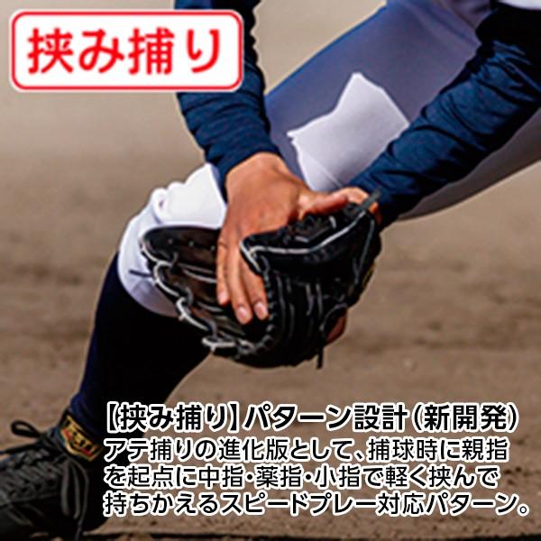 ・【挟み捕り】パターン設計(新開発):アテ捕りの進化版として、捕球時に親指を起点に中指・薬指・小指で軽く挟んで持ちかえるスピードプレー対応パターン。